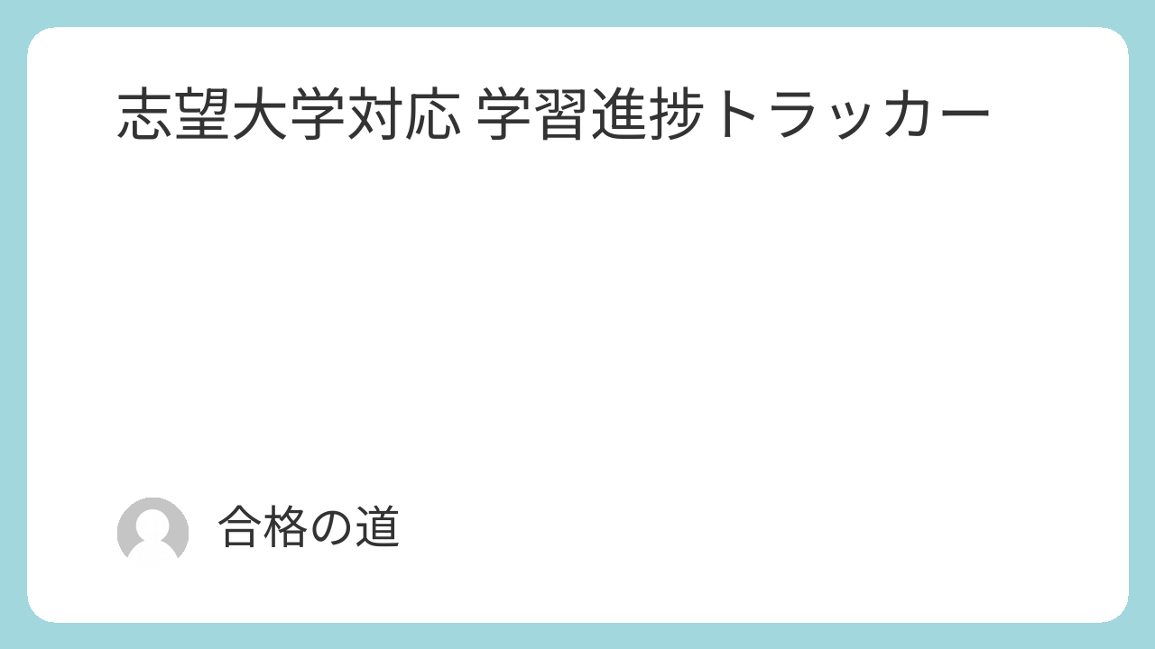 志望大学対応 学習進捗トラッカー X Facebook はてブ LINE Pinterest コピー 2025.11.262025.12.28 目次1 志望大学対応 学習進捗トラッカー1.1 アドバイス1.2 科目別・週推移1.3 日別推移(この月) アドバイス欄の「来週はあと○○分から増やしてみましょう!」の○○に入る数字は、「志望大学の偏差値」から「現状の偏差値」を引いた値に 100 をかけた計算式に基づき、ご提示しております。 志望大学対応 学習進捗トラッカー 目次 志望大学対応 学習進捗トラッカーアドバイス科目別・週推移日別推移(この月) 志望大学対応 学習進捗トラッカー 学年 高1 高2 高3 現状偏差値 志望大学 科目(勉強した科目) 受験に必要な科目(カンマ区切り) 時間(分) 日付 記録する 全て削除 今週合計: 0分 アドバイス 情報を入力して学習を記録してください。 科目別・週推移 日別推移(この月)